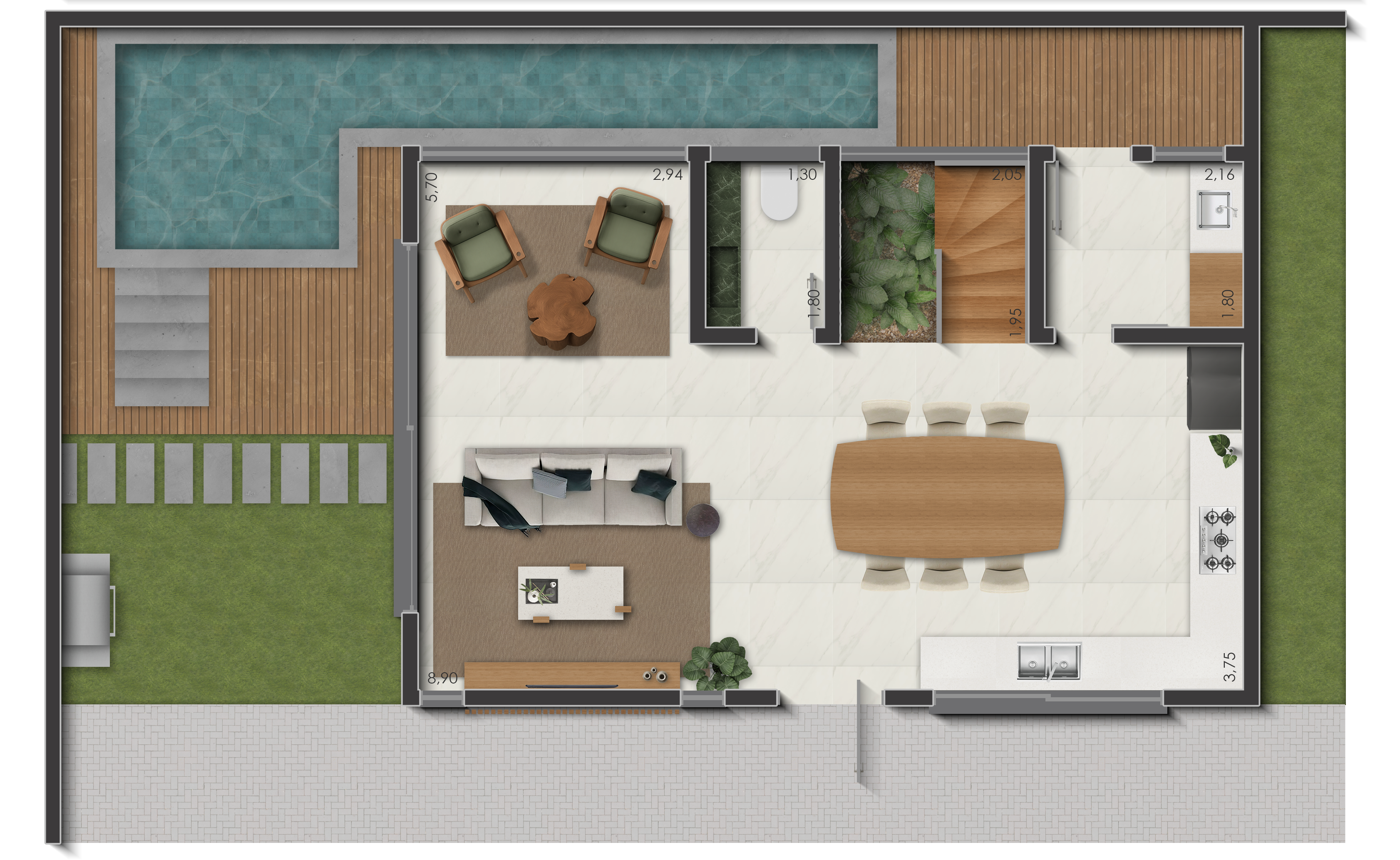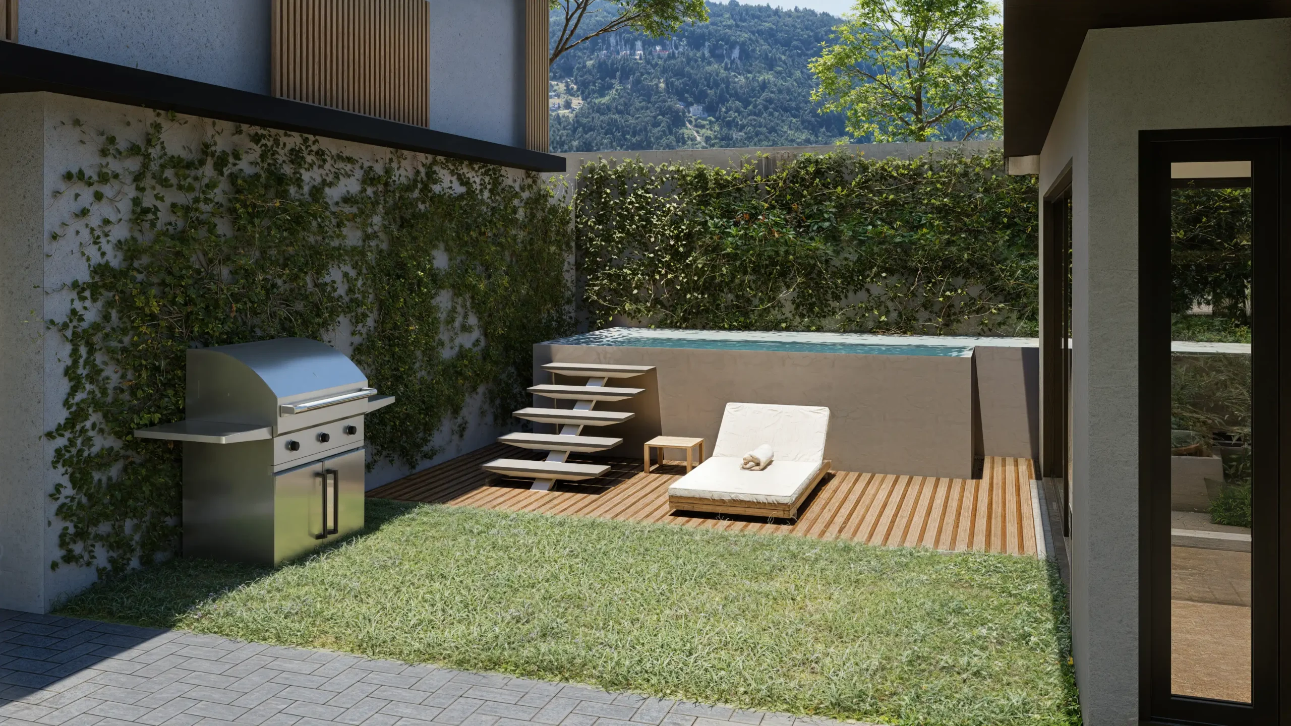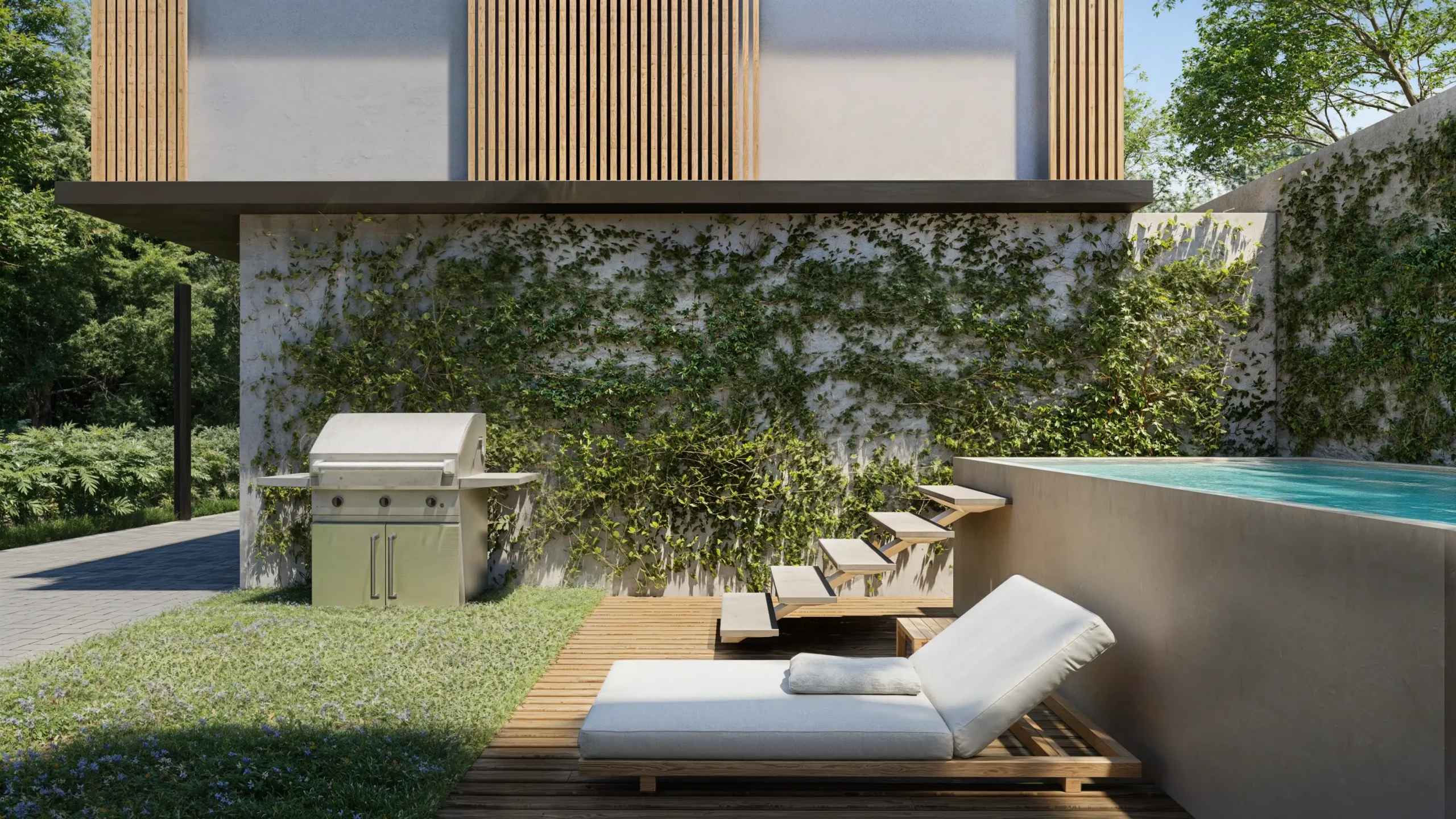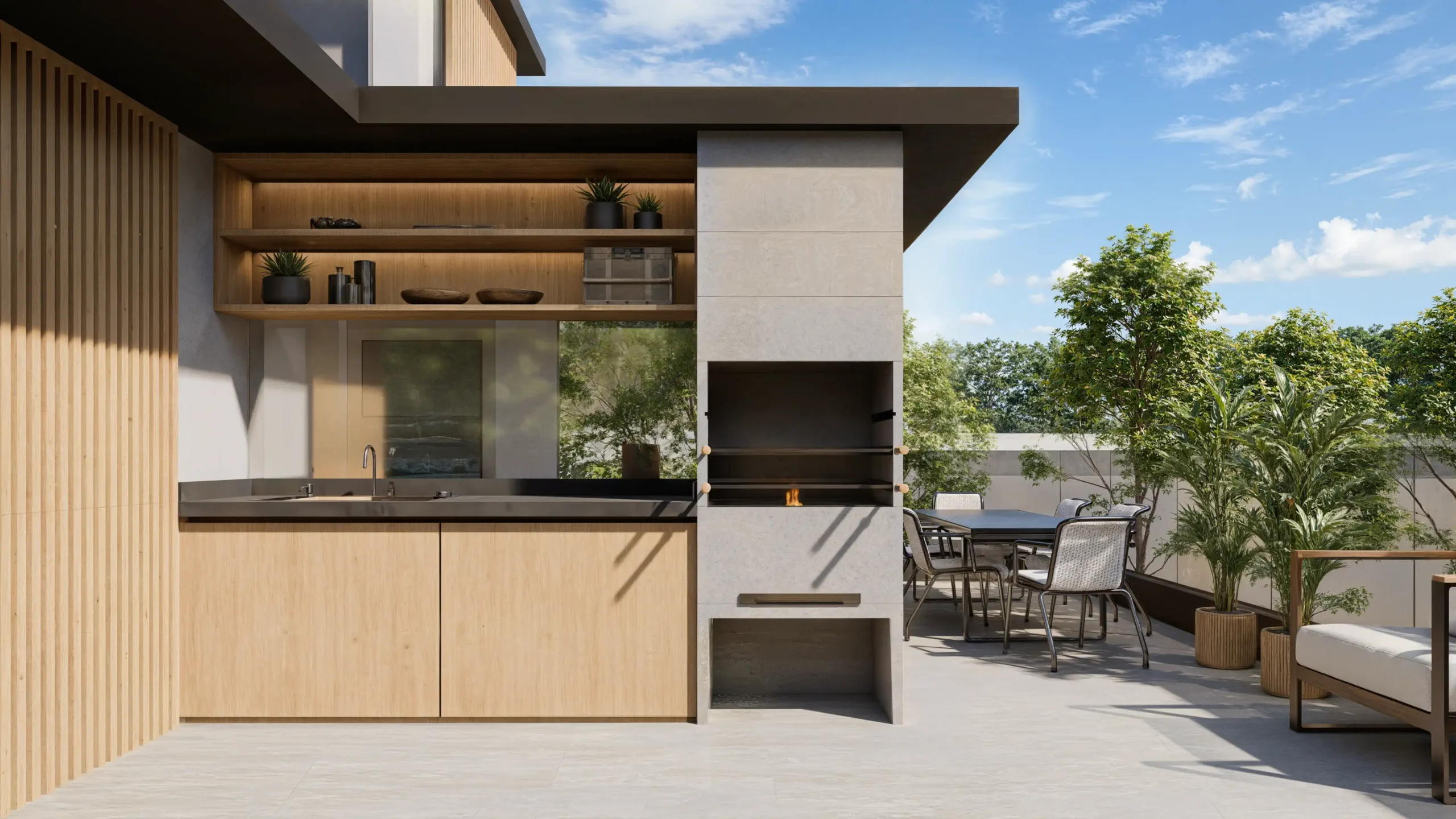No exterior, o lazer é completo: piscina privativa, churrasqueira e um rooftop exclusivo, ideal para apreciar o pôr do sol e o clima tropical de Juquehy.